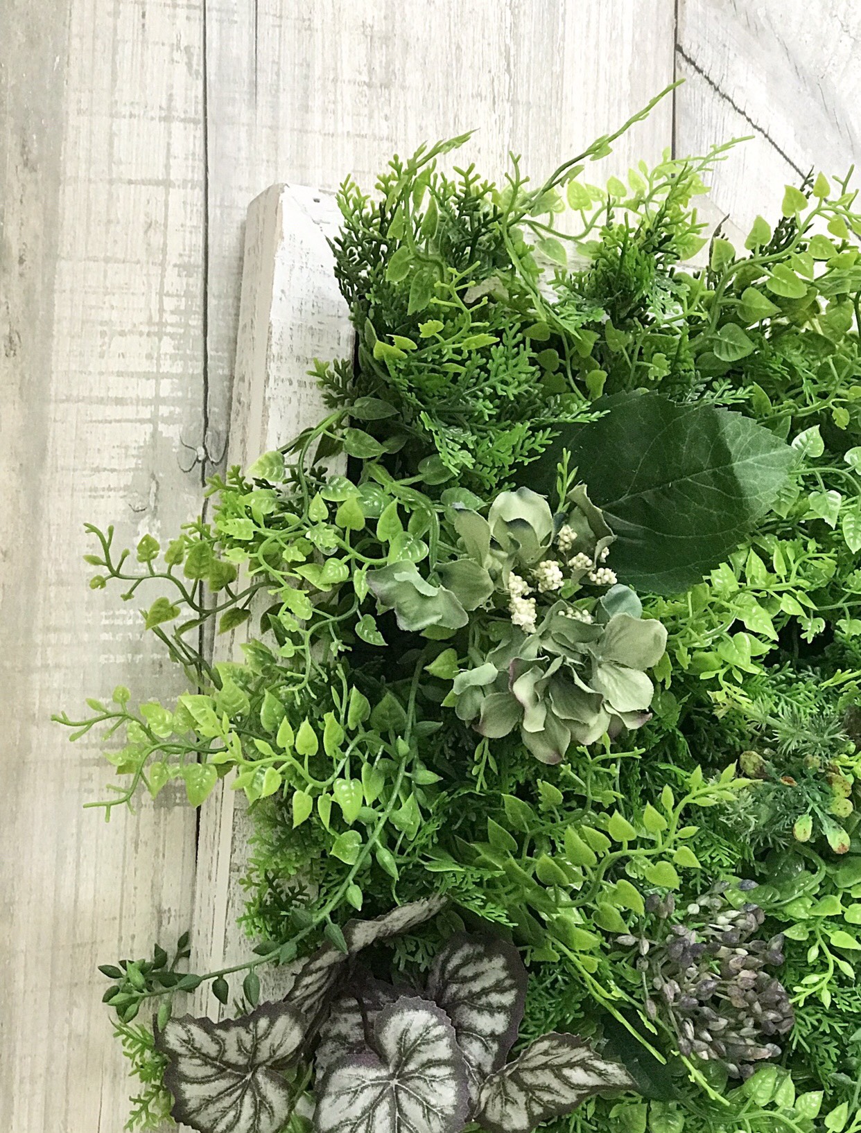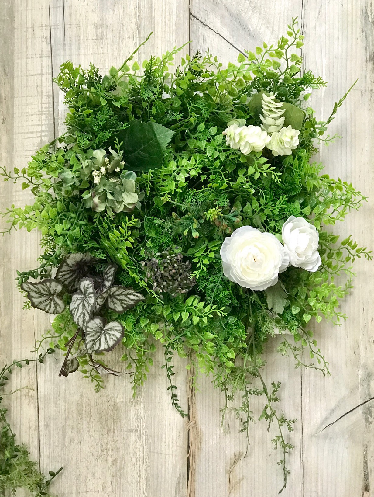 一辺約30センチの白い木の枠から溢れるようなグリーン。