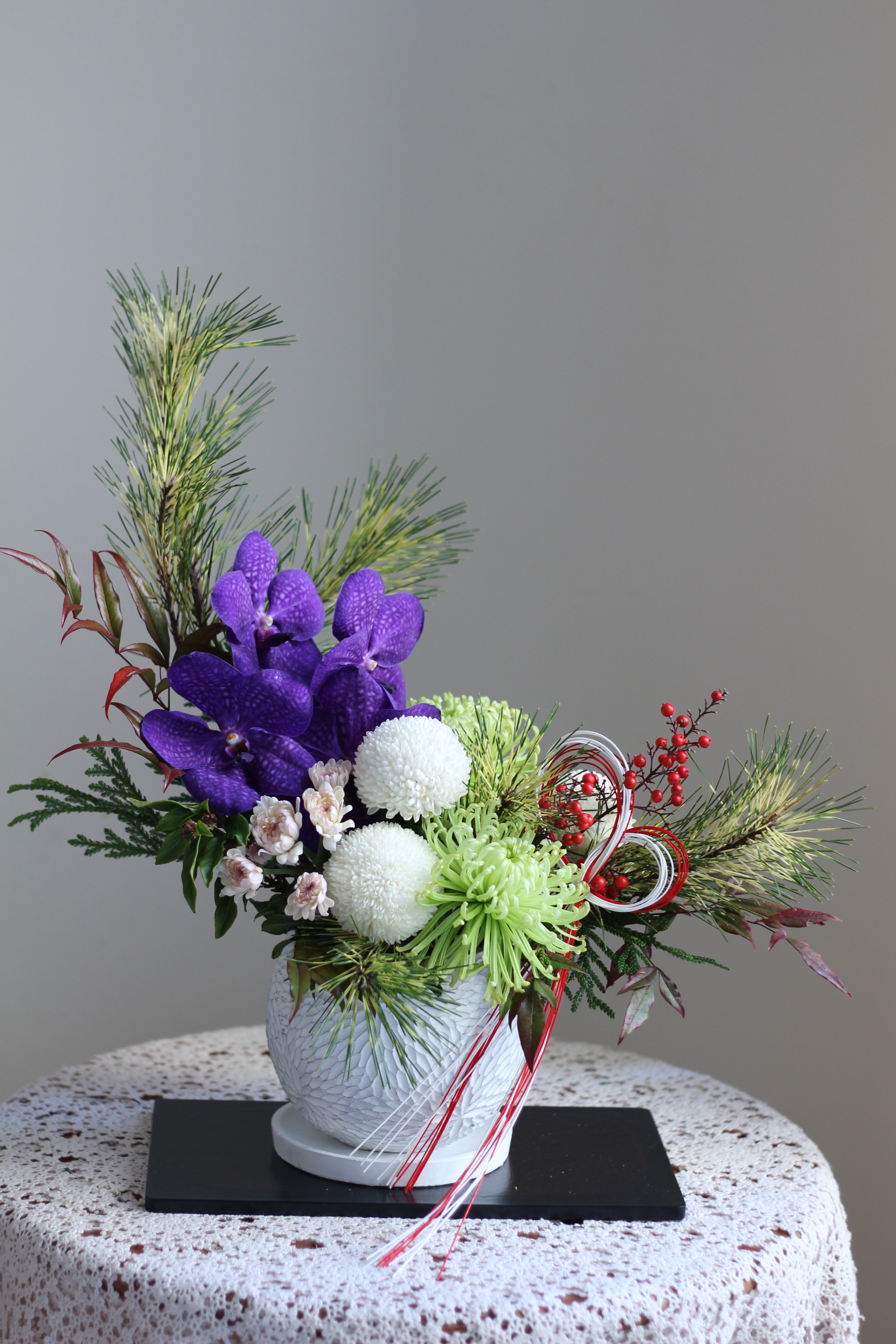 菊や松など伝統的な花材を使って、和モダンに仕上げます。